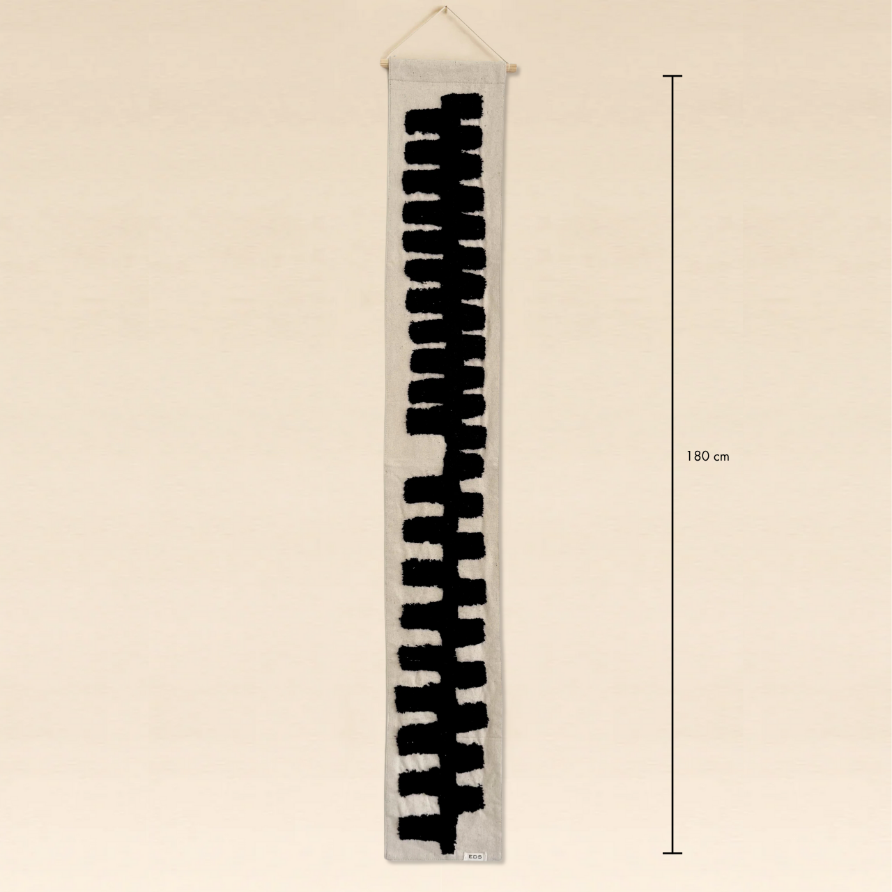 Handmade wall tapestry crafted from natural materials, featuring a bold black and white geometric design in a slim vertical format. Perfect as a modern wall hanging to elevate your living room, bedroom, or hallway.