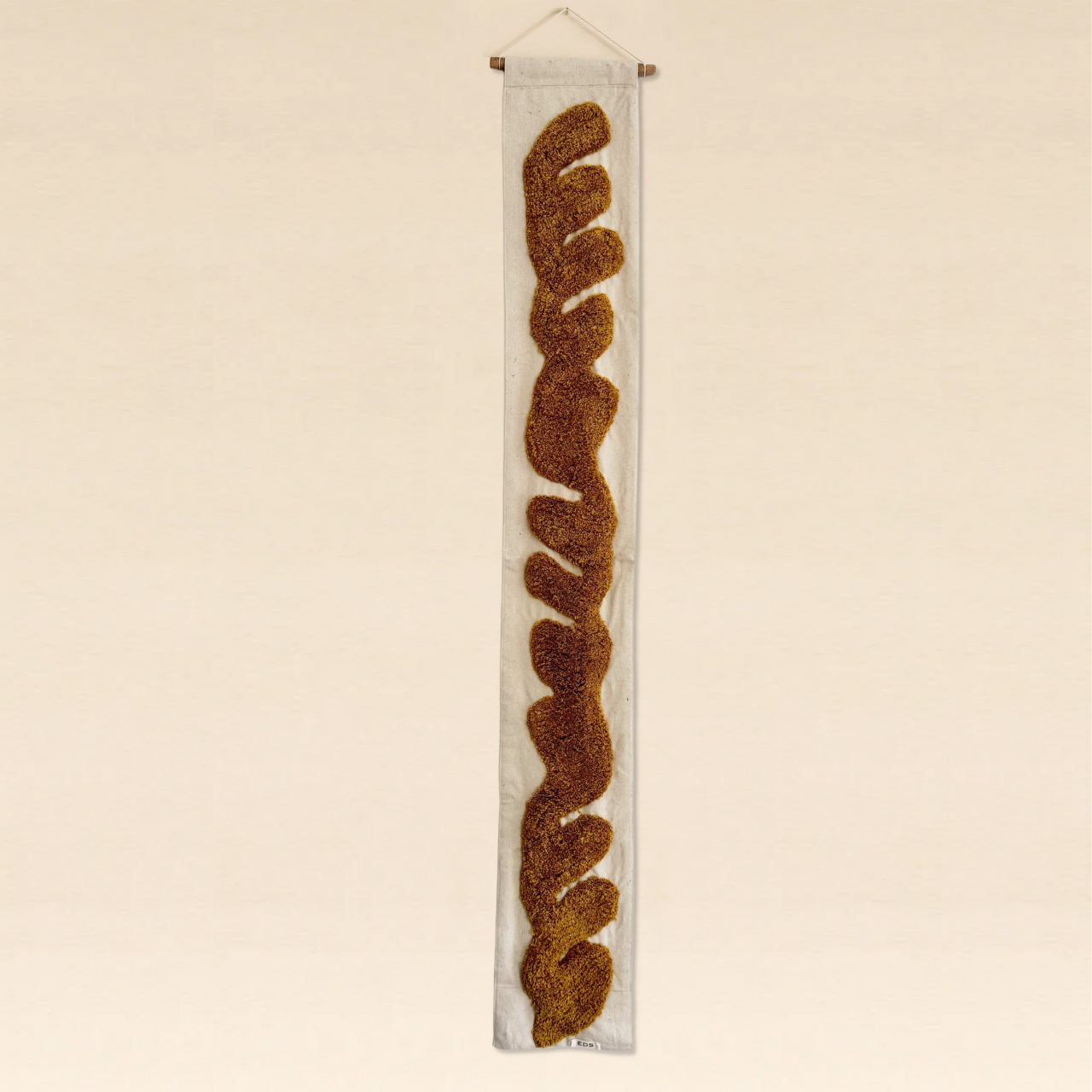 Handmade wall tapestry crafted from natural materials, featuring an organic mustard-colored motif against a soft neutral base. The slim vertical format and tactile texture make it a striking modern wall hanging that adds warmth and natural energy to your home.